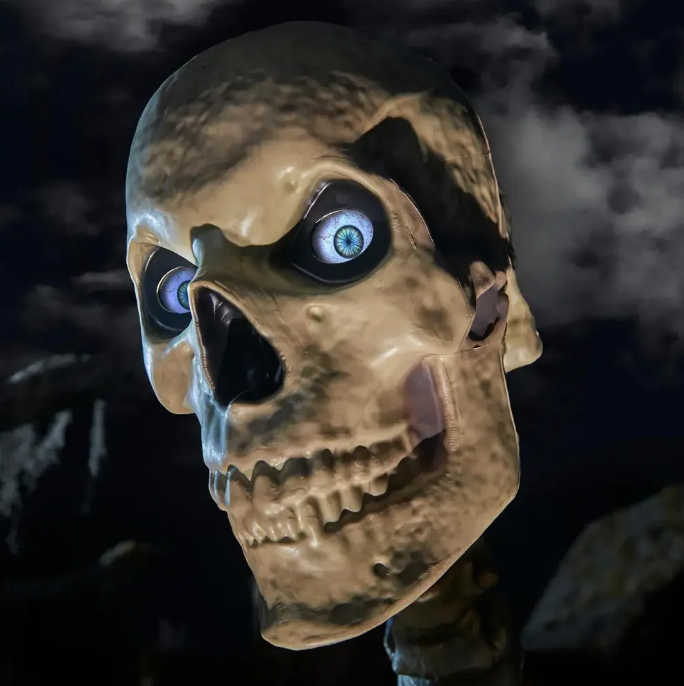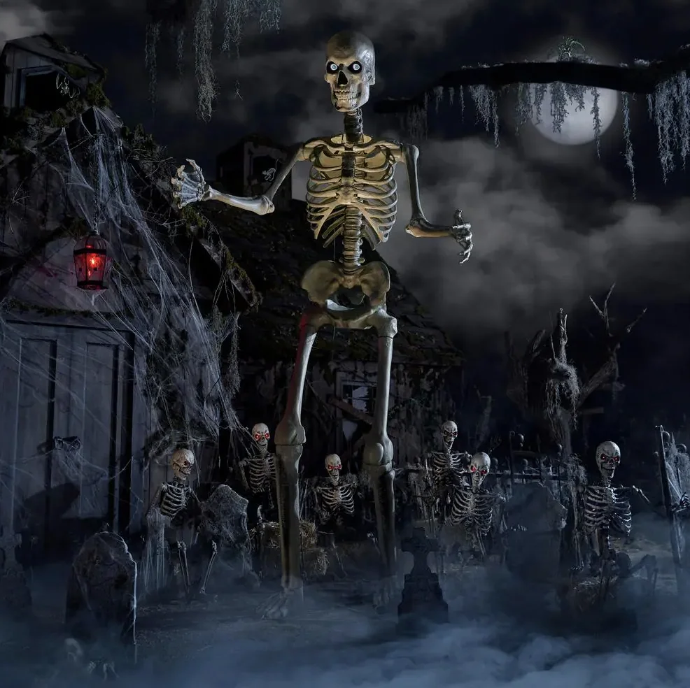 Go big on spookiness with this 12-ft. giant skeleton prop. You can spook people with the LCD eyes that seem to move and blink. Ground stakes keep it secure for a thrilling outdoor display. Comes with durable metal frame and ground stakes for stability. Timer function: 6-hours on/18-hours off. Order today to secure this giant skeleton prop as the centrepiece of your display this halloween!