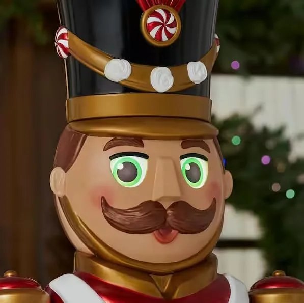 The nutcracker soldier features green LED-illuminated eyes that move from side to side, creating a lively, animated effect. Built-in holiday music enhances the festive atmosphere, making it ideal for welcoming guests and spreading seasonal joy.