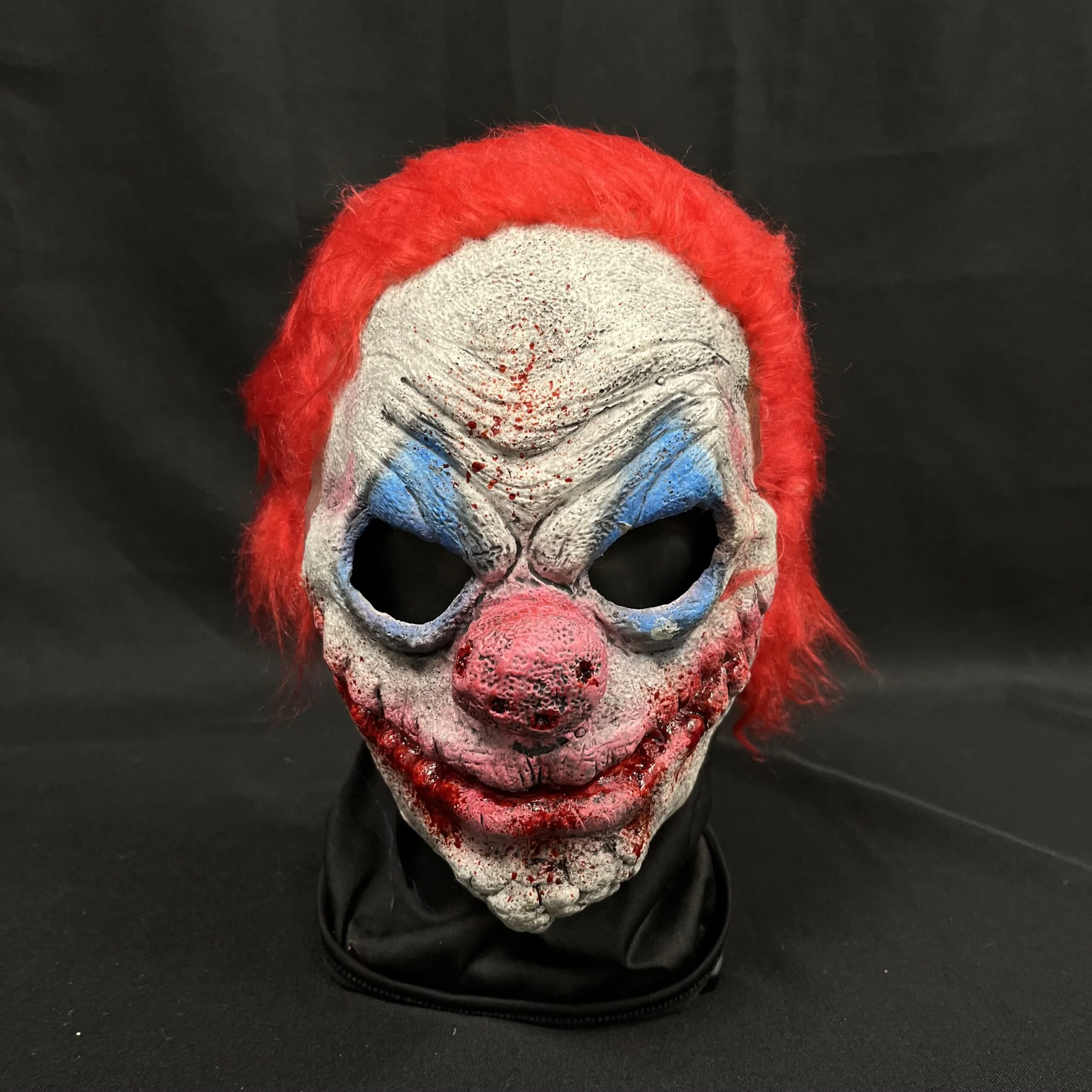Chuckles features a twisted clown design, with exaggerated facial features and a sinister smile that brings an unsettling charm to any Halloween event or haunted attraction. The vivid hand-painted finish enhances the worn, menacing character of the mask, ensuring it stands out in any setting.