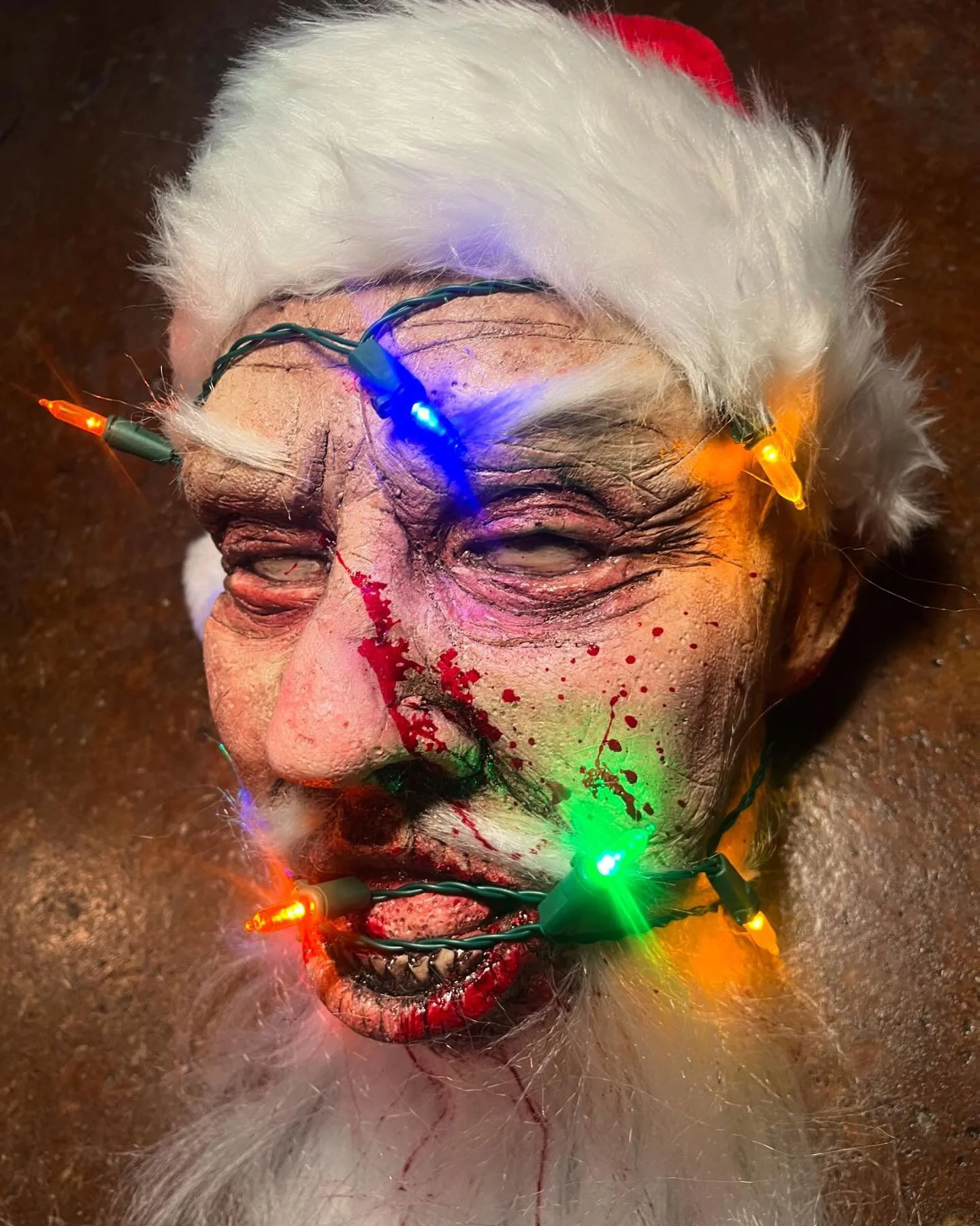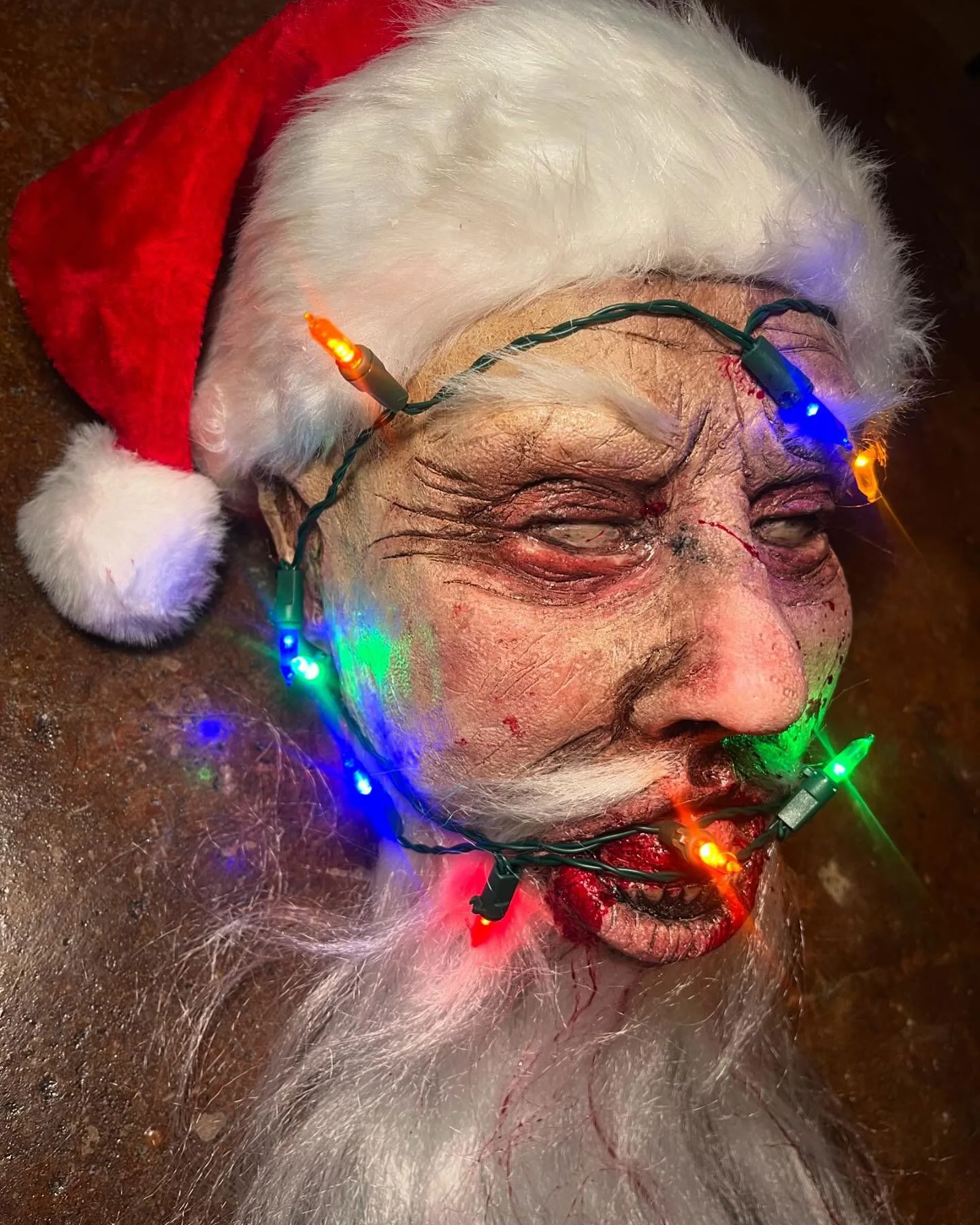 Bring holiday cheer to a grisly end with the Severed Santa Head from Pumpkin Pulp—a disturbingly detailed horror prop that blends Christmas spirit with full-blown nightmare fuel. Handcrafted with professional-grade latex and foam, this realistic severed head features Santa’s signature red hat, light up Christmas lights, tangled white beard, and a mutilated, bloodied face that’s anything but jolly.